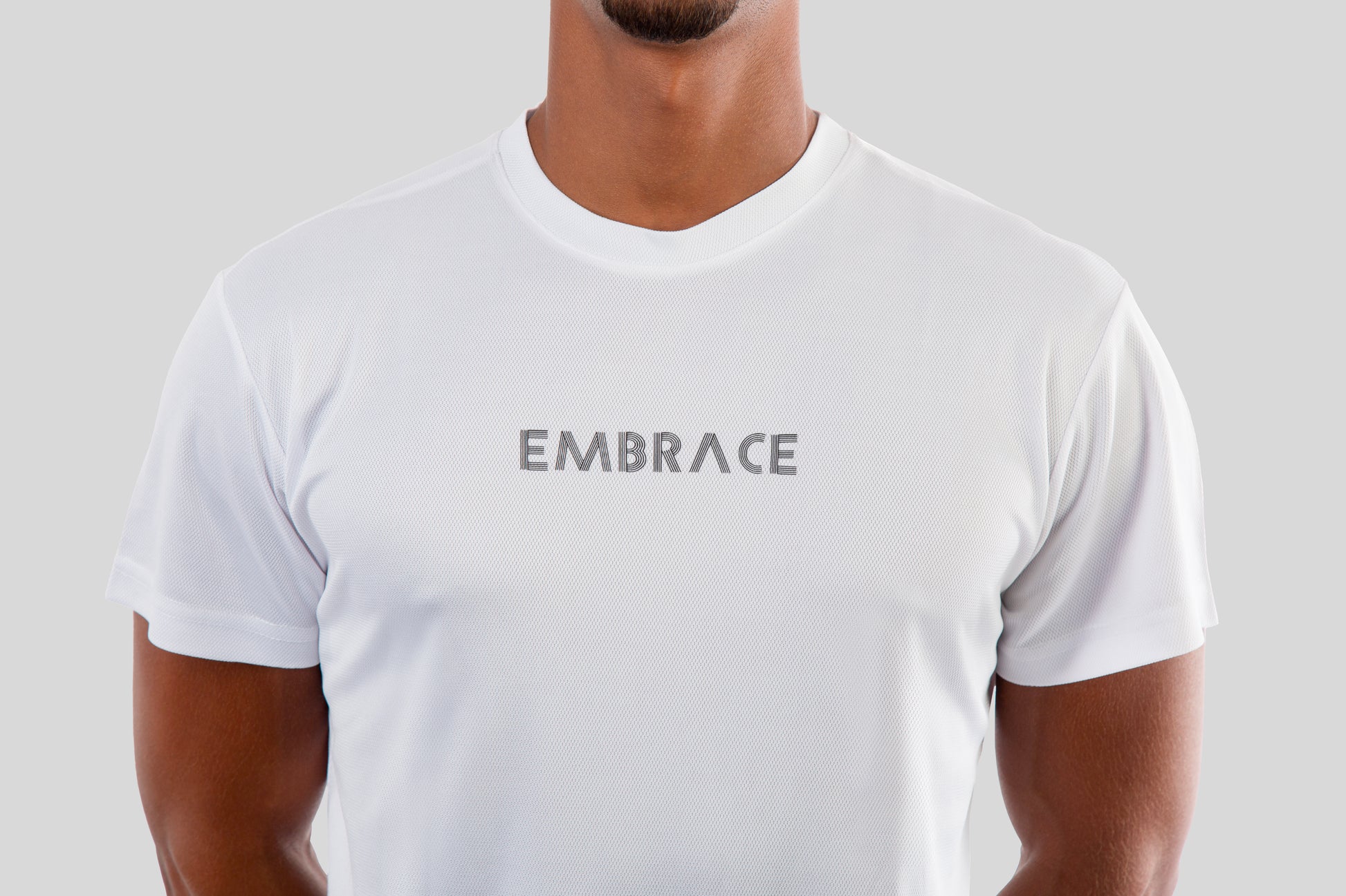Featuring a sleek design with "EMBRACE" subtly printed across the chest, this tee looks great both in and out of the gym. The versatile white color complements any athletic wardrobe, making it a must-have addition to your fitness apparel collection.