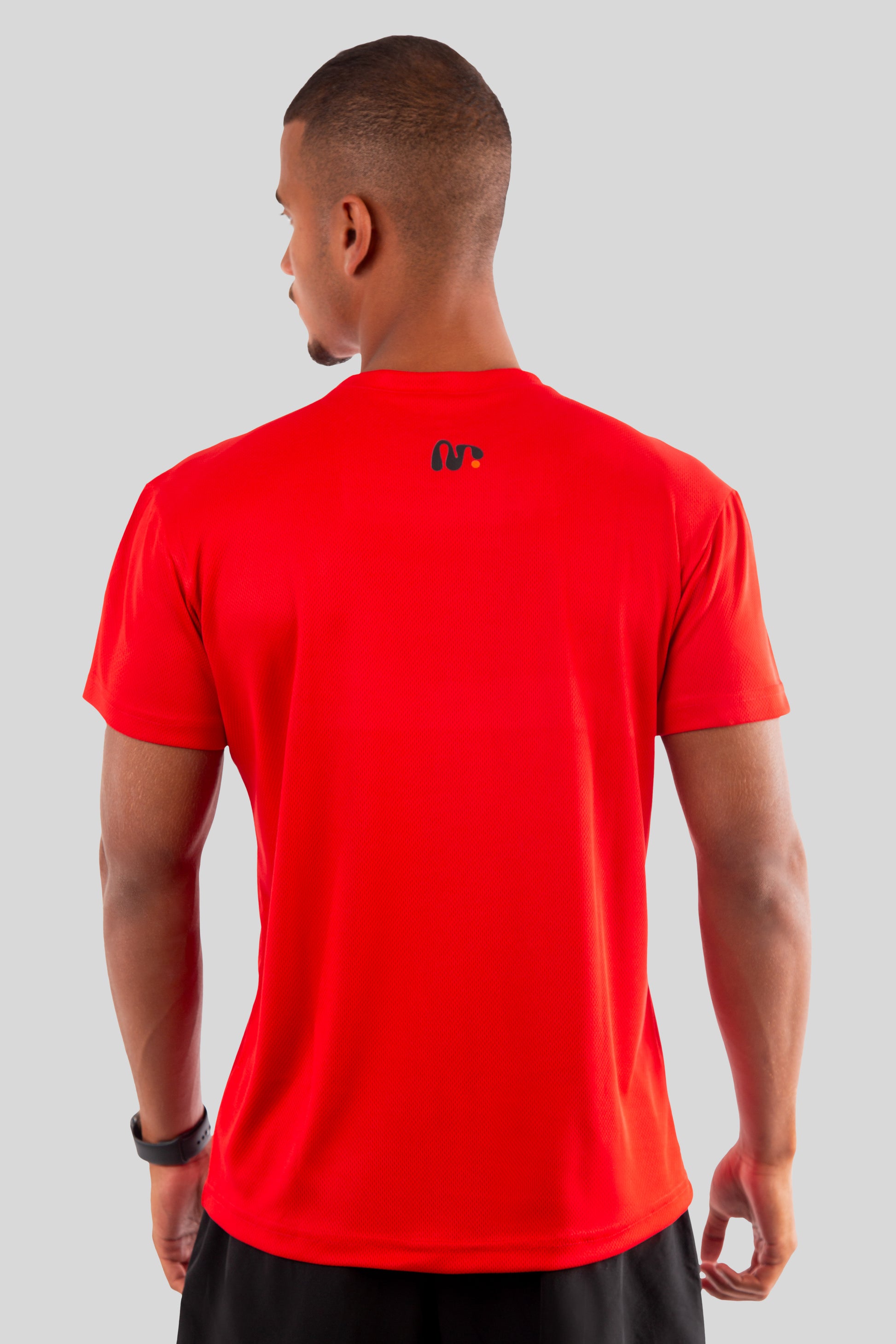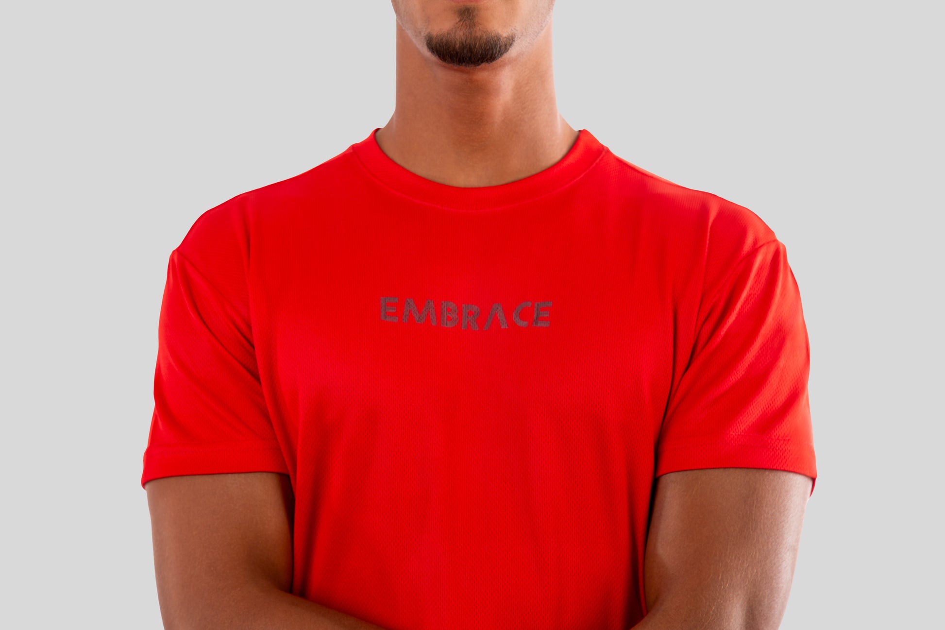Featuring a sleek design with "EMBRACE" subtly printed across the chest, this tee looks great both in and out of the gym. The versatile red color complements any athletic wardrobe, making it a must-have addition to your fitness apparel collection.